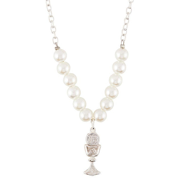 Cuenta con un colgante de cáliz con cuentas de perlas de imitación blancas.