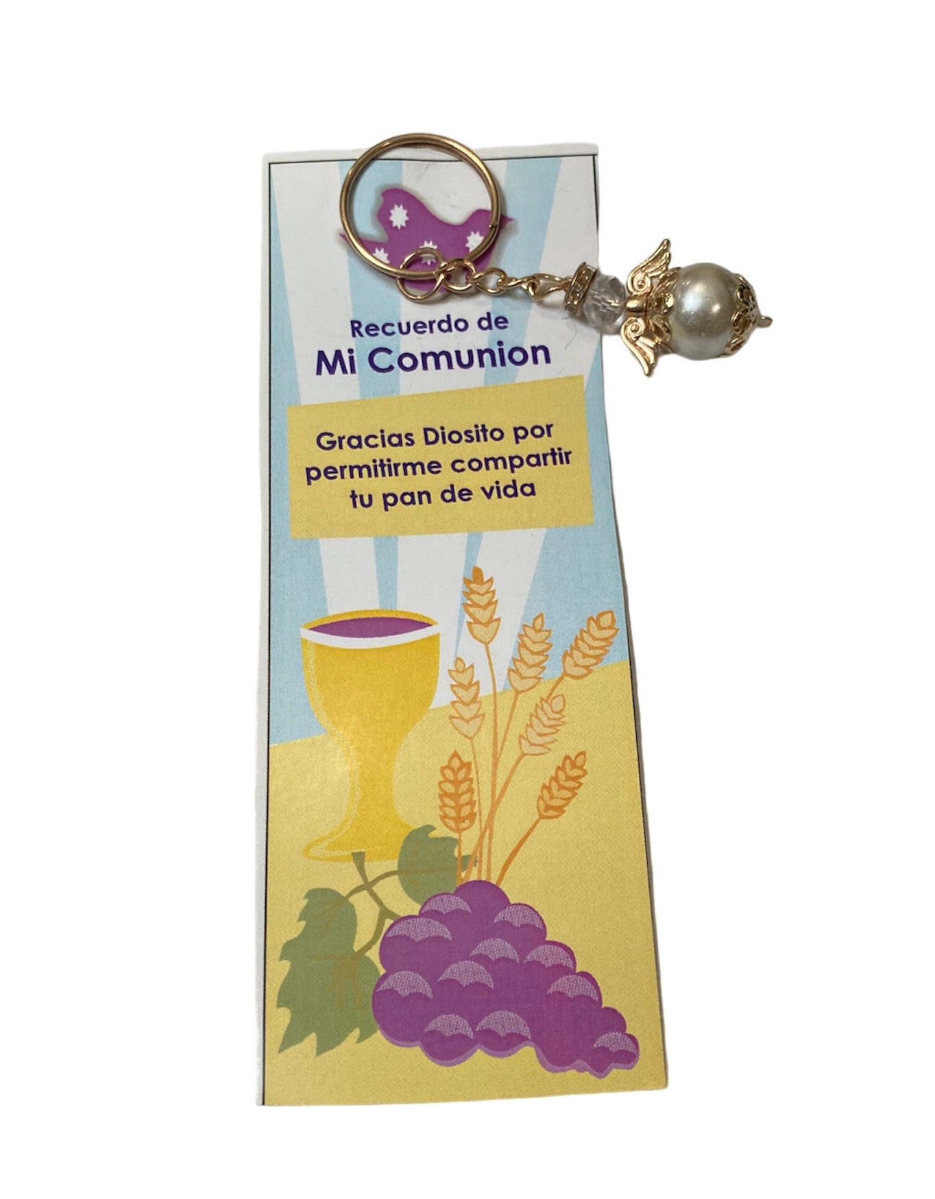 Llavero de angelito con oración "Gracias a dios por permitirme compartir tu pan de vida"