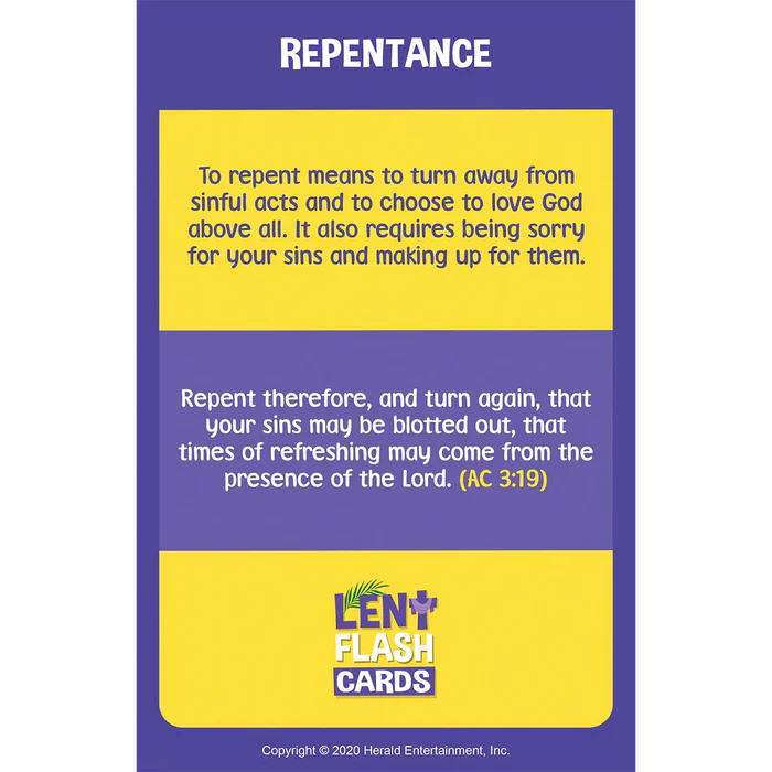 Lent is a special time in which we draw close to God in preparation for Holy Week. We examine our hearts prayerfully and resolve to turn away from the things in our life that are not pleasing to God. This collection of 40 Lent Flash Cards will help young children understand the rich meaning of the Lenten Season.